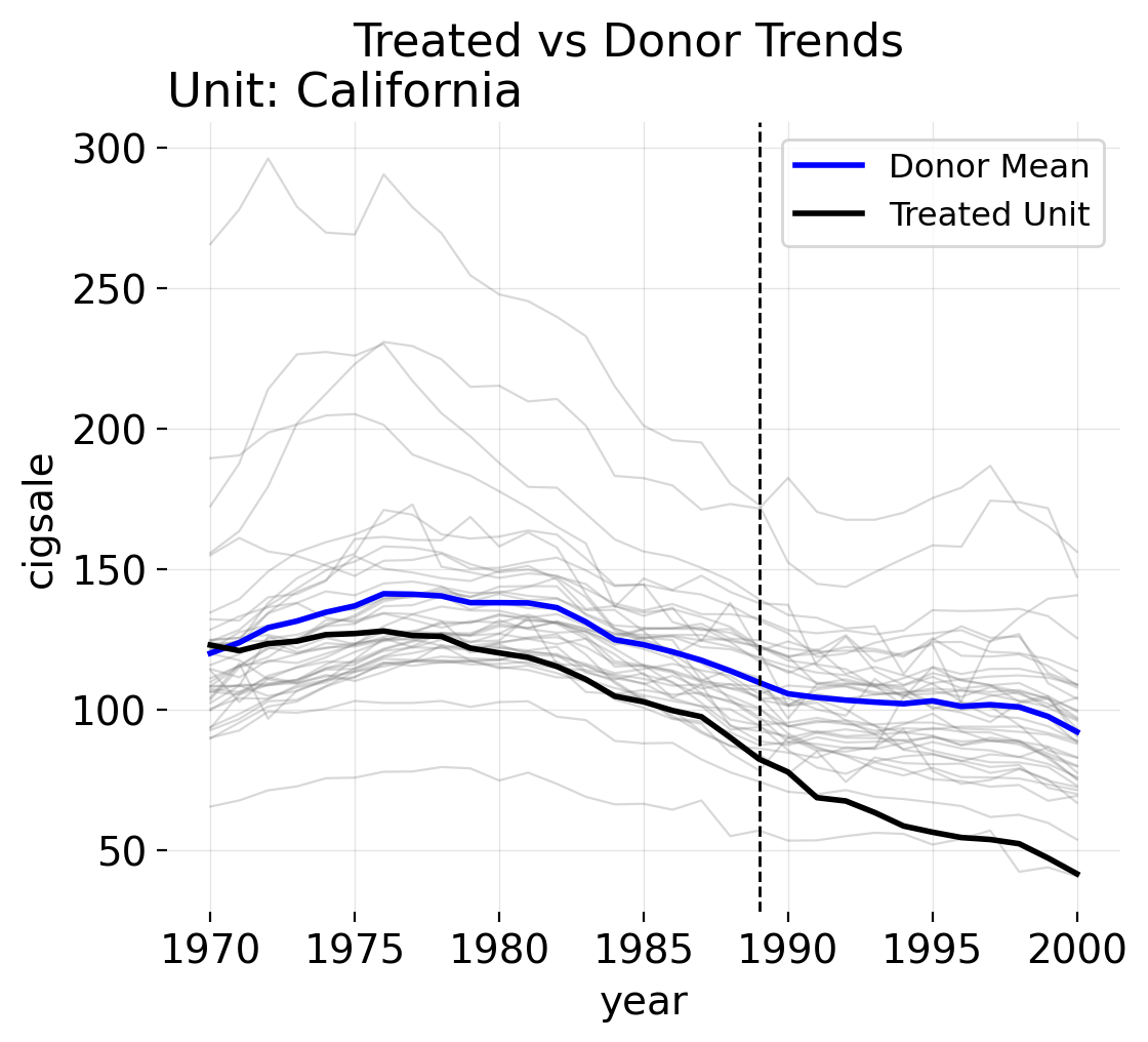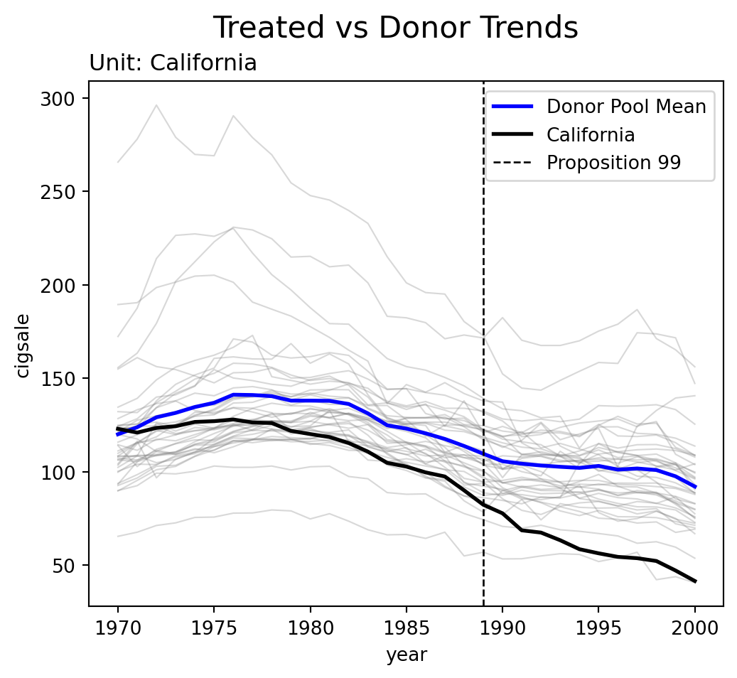Parallel trends does not appear to hold for California with respect to its donor pool. California has a steeper downward sloping trend of cigarette consumption compared to the average of the donor pool. No matter what scalar constant we would shift the mean of the donor pool by, the mean difference would not be constant with respect to California. This suggests one of two solutions is viable: either parallel trends would hold with some control units, or we simply need to re-weight the donor pool to better match the pre-intervention trajectory.