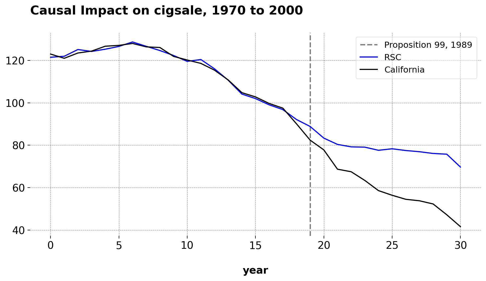 Here is the results of the CLUSTERSC class. This class implements the Robust Synthetic Control Method. We can see that this model fits the pre-treatment trajectory very well, without needing to use any of the seven covariates that the original paper uses.
