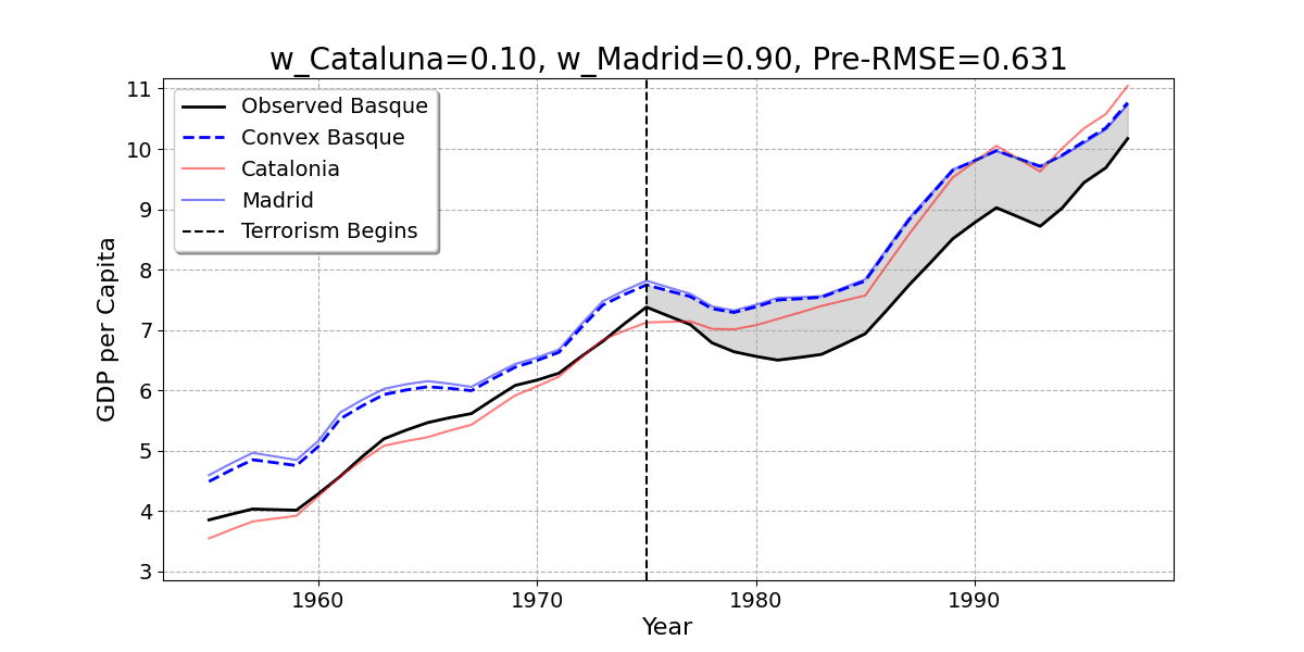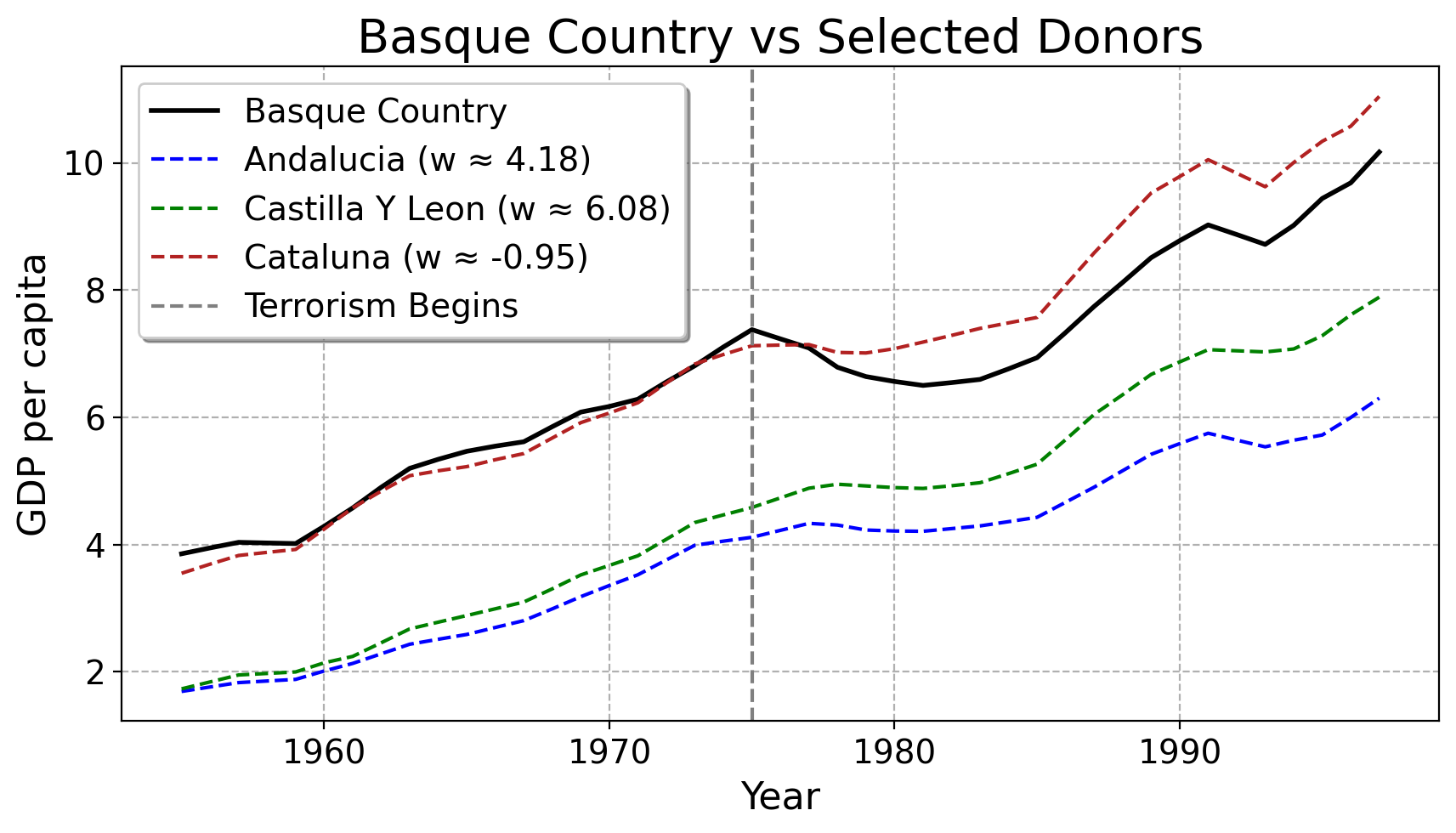 We want to combine the donor regions to best match the treated unit before the intervention. By requiring all weights to be nonnegative and sum to 1, the synthetic Basque is a weighted average that stays inside the range of the donors—it can’t “overshoot” or assign negative importance to any region.