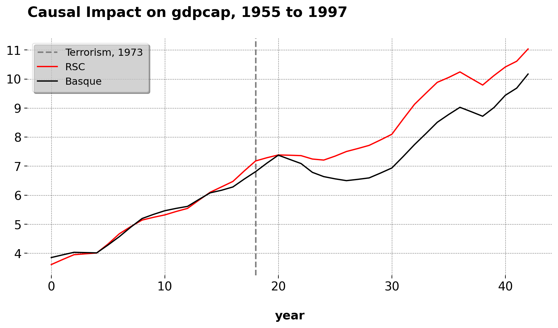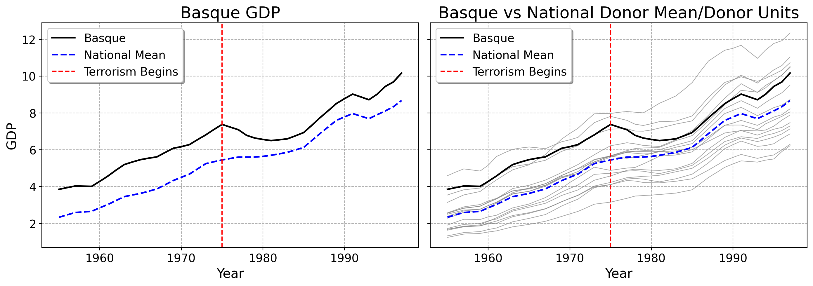 We can see the Basque column as well as some of the donor columns. We wish to take a weighted average of these control unit columns to approximate the Basque Country in the preintervention period. Given that there is good pretreatment fit between the weighted average and the Basque Country, the post-1975 predictions serve as the counterfactual estimate.