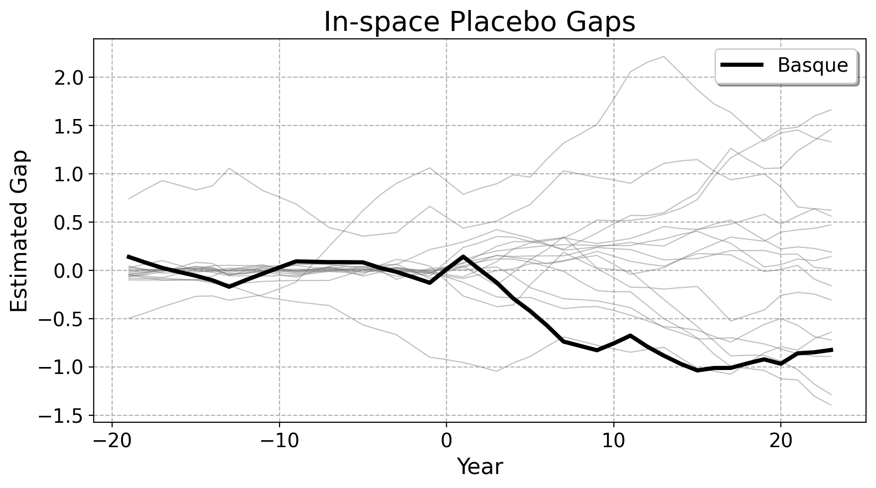Condition (placebo): the treated unit’s post-treatment gap should be an outlier relative to the placebo distribution. If \(\widehat{\text{ATT}}_1\) is the treated ATT and \(\{\widehat{\text{ATT}}_j\}_{j\neq 1}\) are placebo ATTs, \[