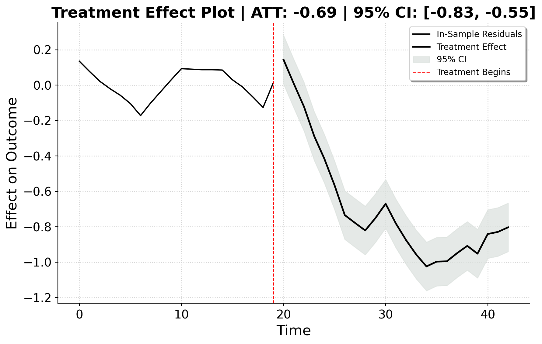 Post-treatment treatment effects: difference after treatment: \[ \hat{\tau}_{1t} = y_{1t} - \hat{y}_{1t}, \quad t \in \mathcal{T}_2 \]