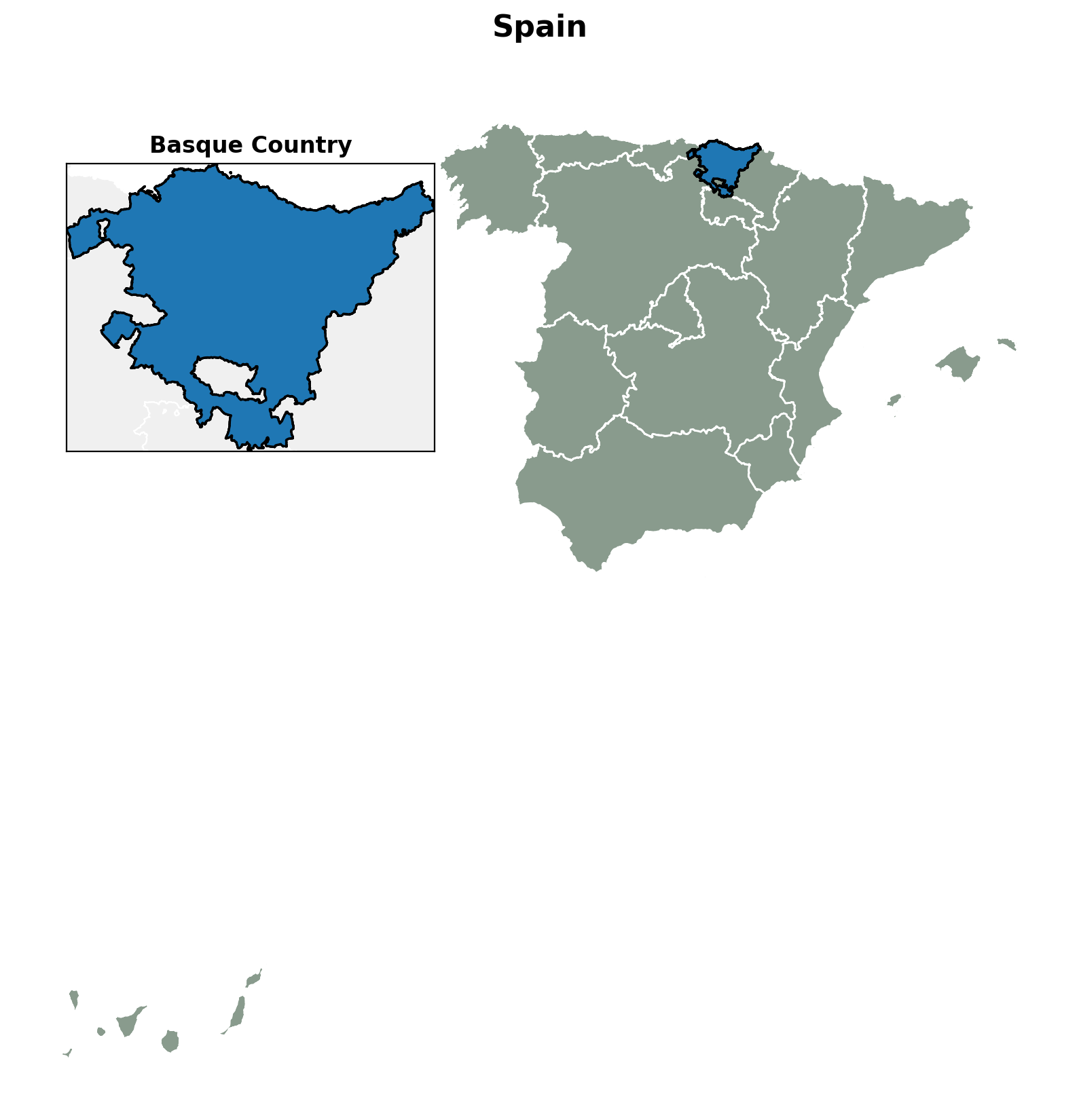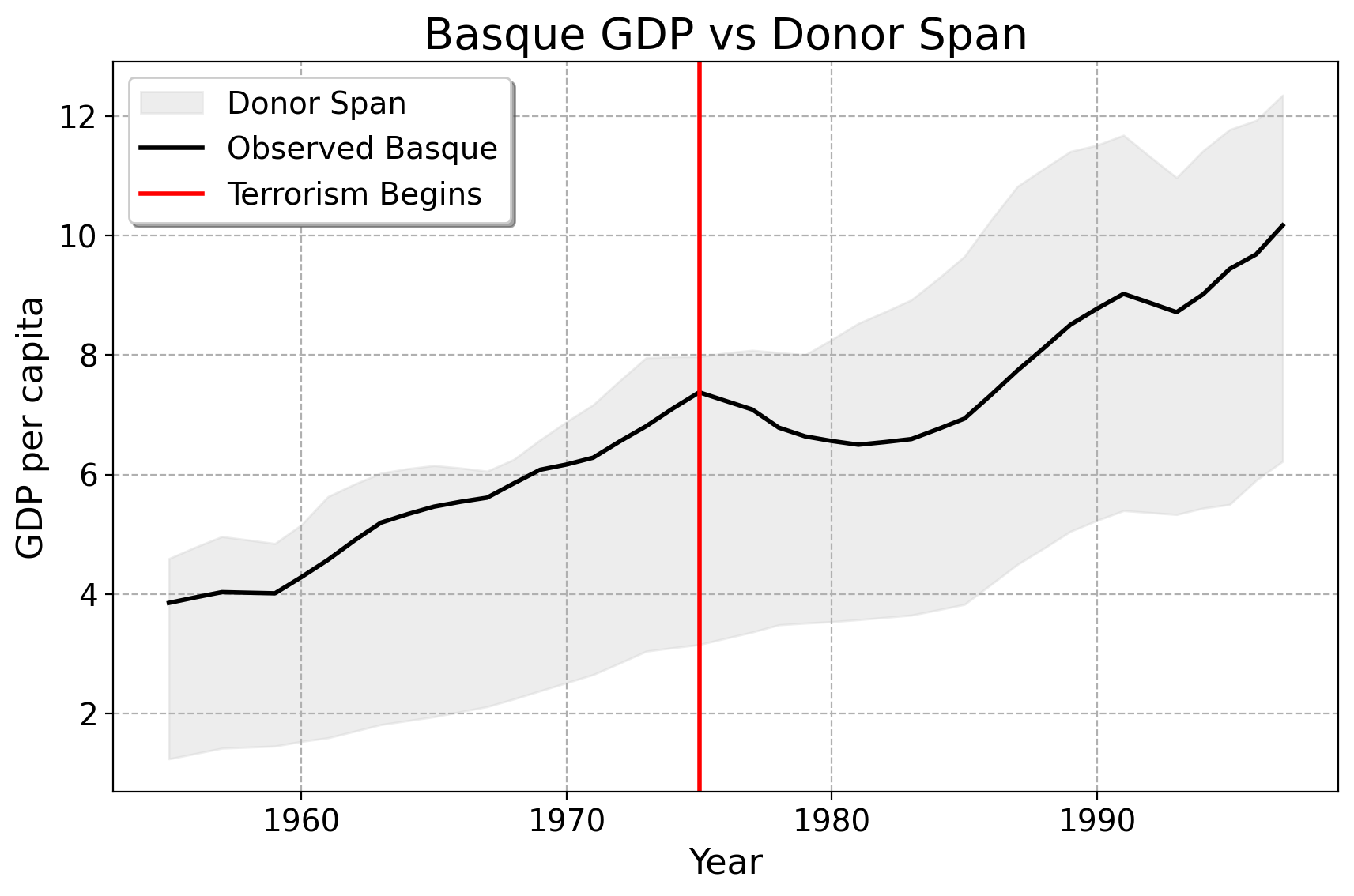 The plot below shows the area spanned by all donor regions in Spain (shaded), along with the Basque Country. This visualizes the full feasible range for any weighted average of donors.