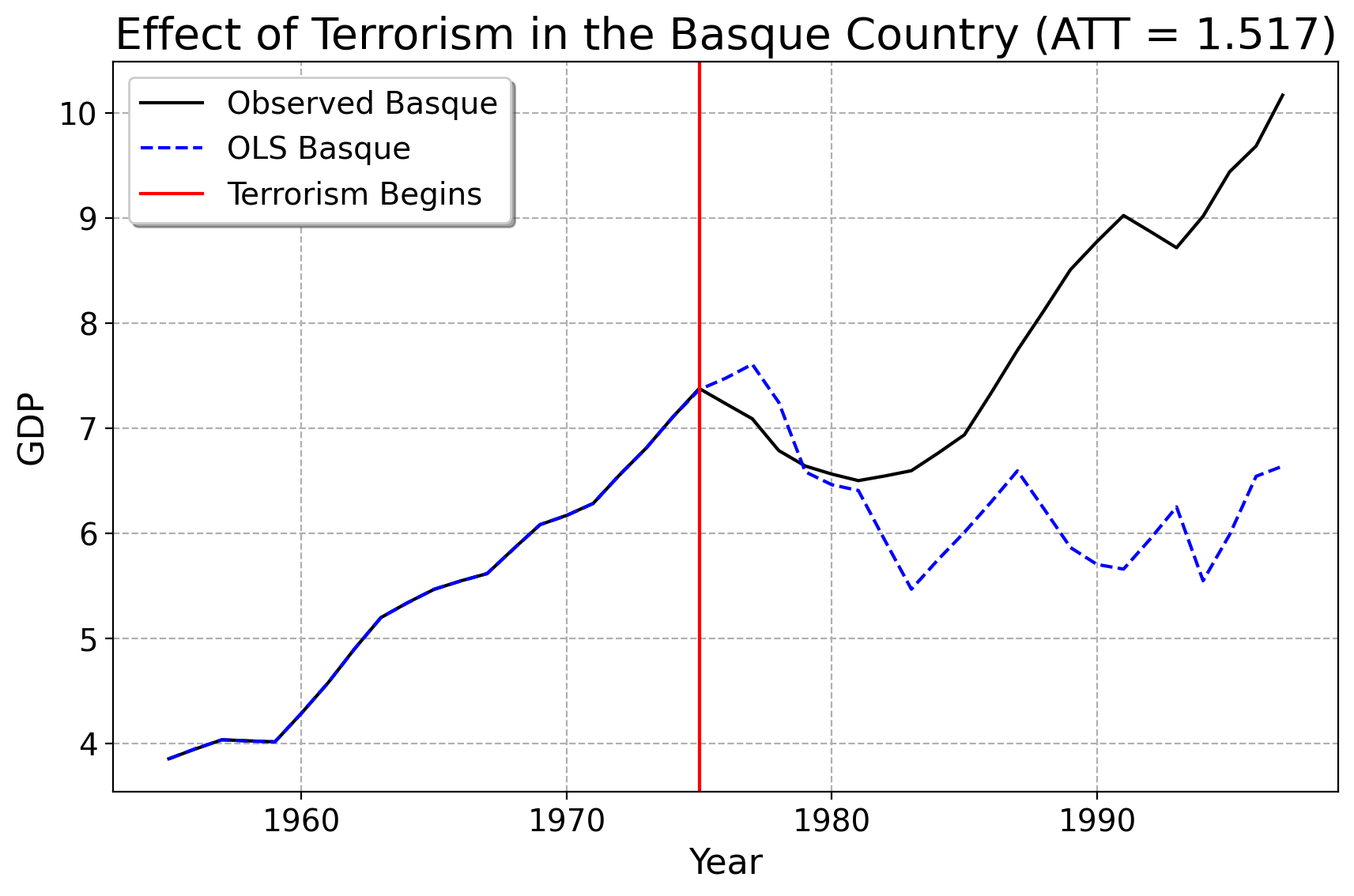 Here is our prediction using OLS. Unfortunately, while OLS fits very well to the Basque Country before terrorism happened, the out-of-sample/post-1975 predicions exhibits a lot more variance than any control unit in the pre-treatment period did. The counterfactual has a weird zig-zag-y prediction. We can see that the prediction line for the Basque country suggests that its economy would have fallen off a cliff, had terrorism not happened. In other words, if the OLS estmate is to be taken seriously, the onset of terrorism saved the Basque economy… This does not seem like a sensible finding historically, or a very reasonable prediction statistically.